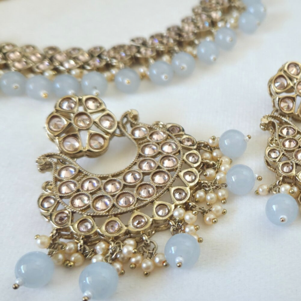 Een mooie elegante set, wat geschikt is om te dragen bij elke speciale gelegenheid. De set bestaat uit ketting, oorbellen en maang teeka met champagne en dusty blue kleurige parels.